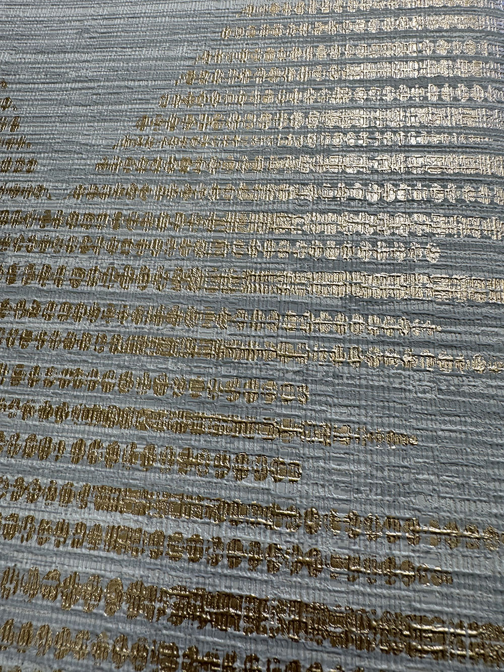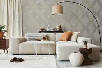 Plastická, šedo-béžová vliesová tapeta na zeď, geometrický vzor, zlaté linie tvoří kosočtverce.