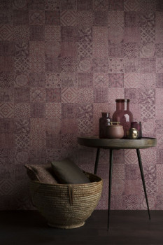 Vliesová tapeta s jemně plastickým mozaikovým vzorem s patinou. Odstíny hnědé a cihlové.