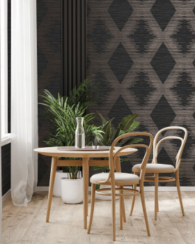 Plastická černá vliesová tapeta na zeď, geometrický vzor, linie v barvě růžového zlata tvoří kosočtverce.