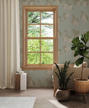 Strukturovaná modro-zelená vliesová tapeta na zeď, motiv rozkvetlé Vistárie, květy v pololesklých metalických odstínech béžové, zlaté.