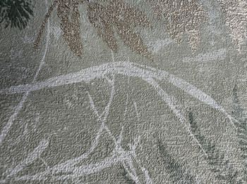 Šedá strukturovaná vliesová tapeta na zeď, imitace štukové omítky, dekor listů a květiny v odstínech šedé a metalické zlaté.