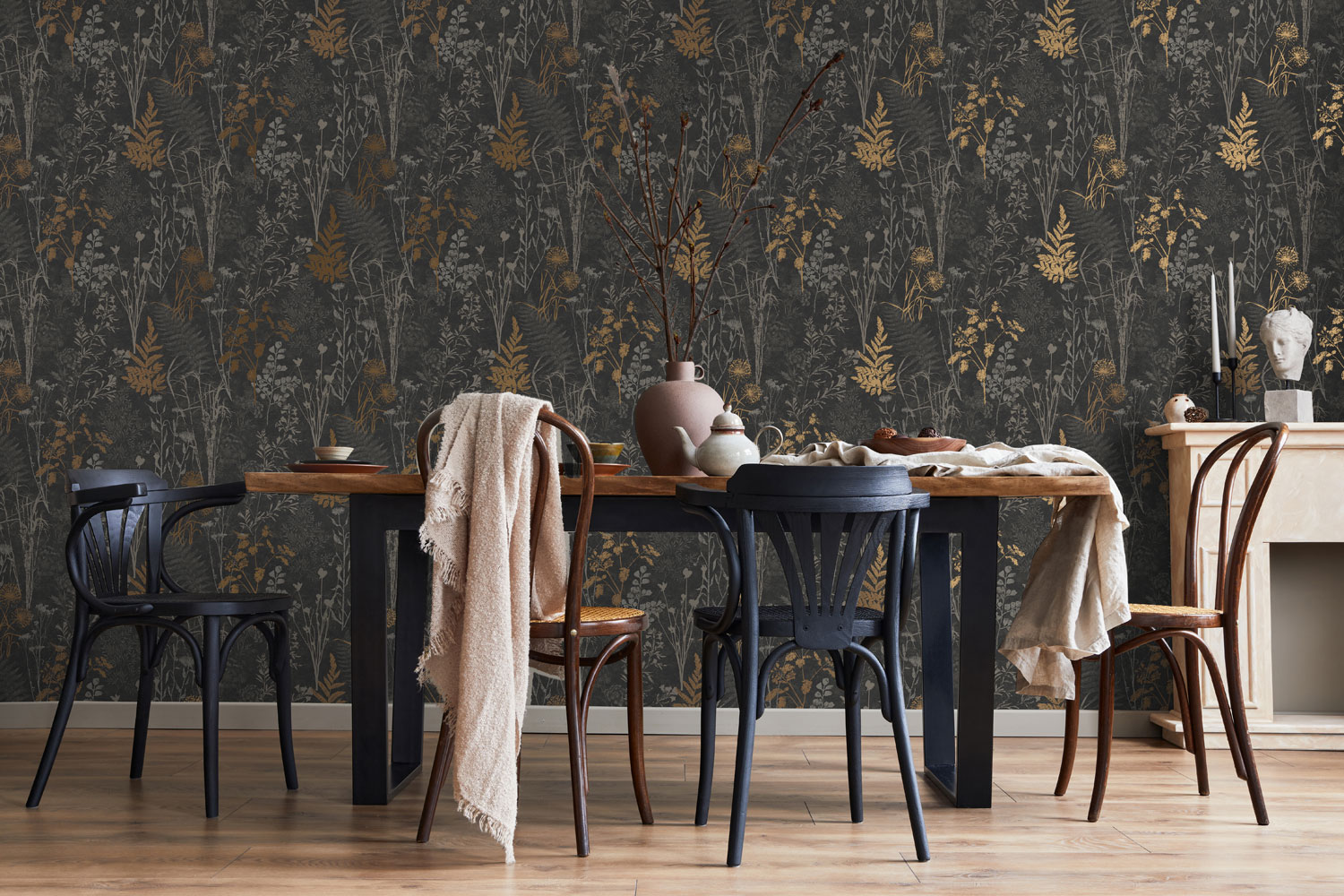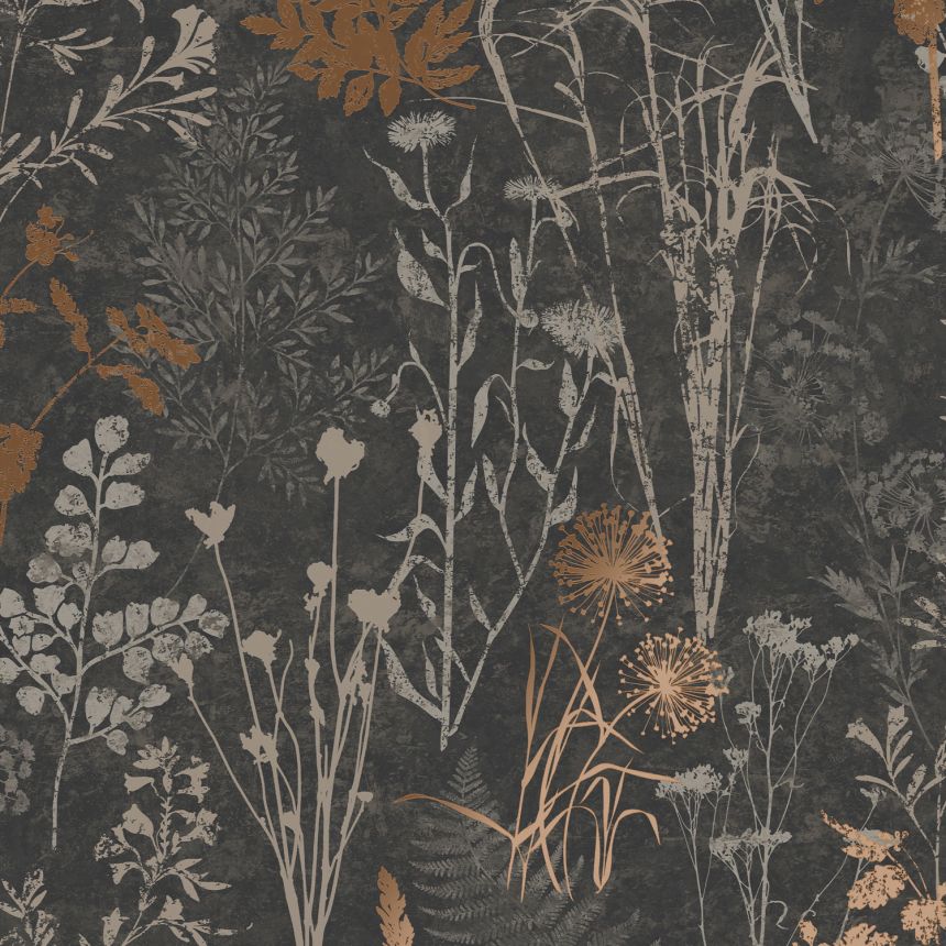 Černá vliesová tapeta na zeď, květiny, listy, 120718, Vavex 2025