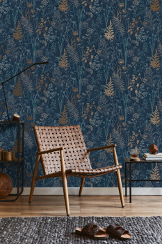 Tmavě modrá strukturovaná vliesová tapeta na zeď, imitace štukové omítky, dekor listů a květiny v odstínech modré, šedé a bronzové.