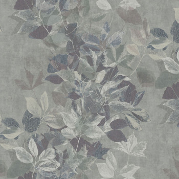 Zelená vliesová tapeta s vinylovým povrchem, motivy listů, některé listy v odstínech fialové a modré.