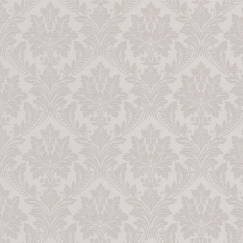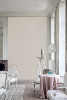 Pololesklá béžová zámecká vliesová tapeta s vinylovým povrchem, imitace jemné textilie, damaškový vzor.