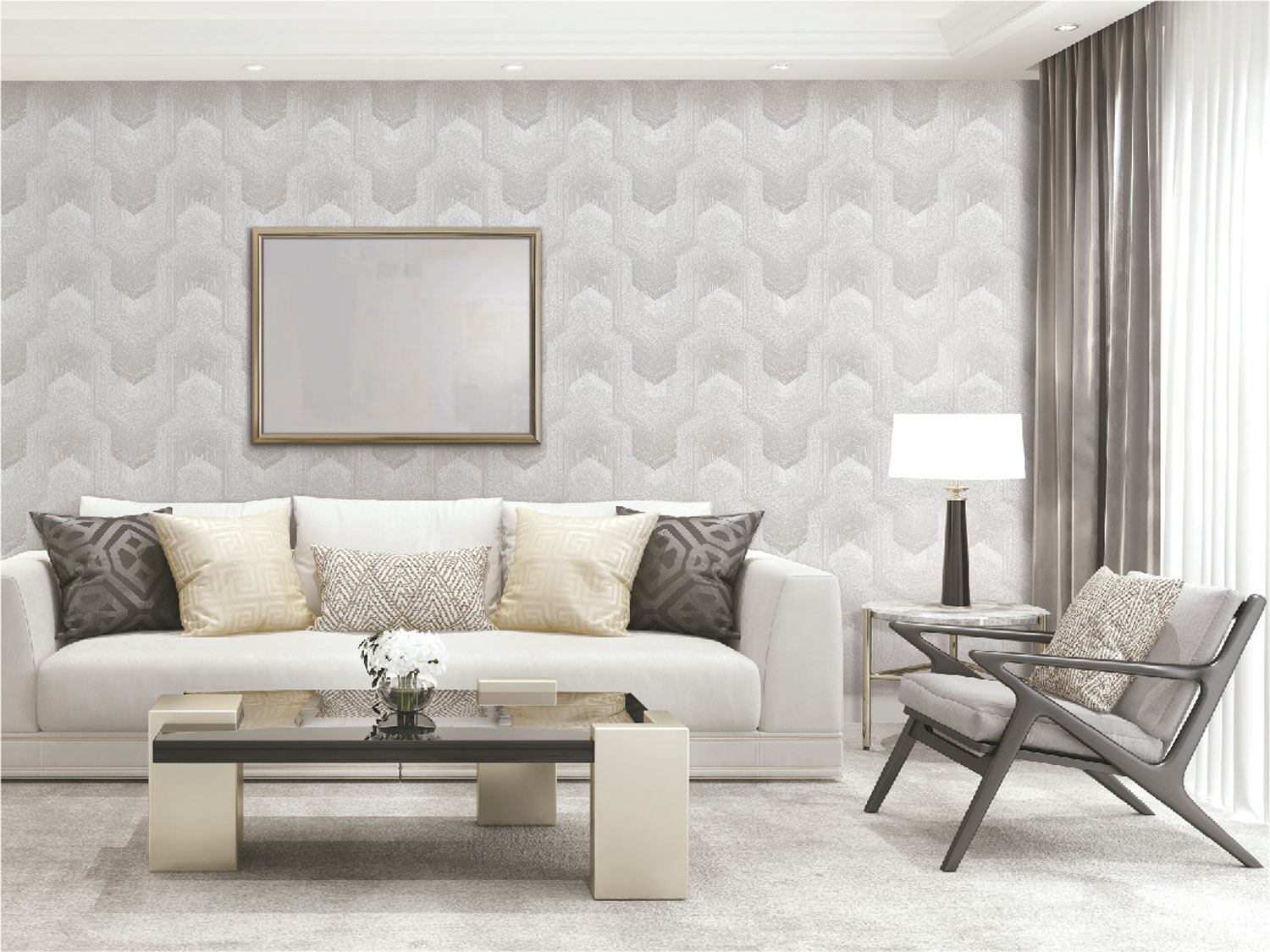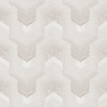 Šedo-bílá vliesová tapeta s vinylovým povrchem, efektní geometrický vzor s perlovými odlesky, textilní struktura.