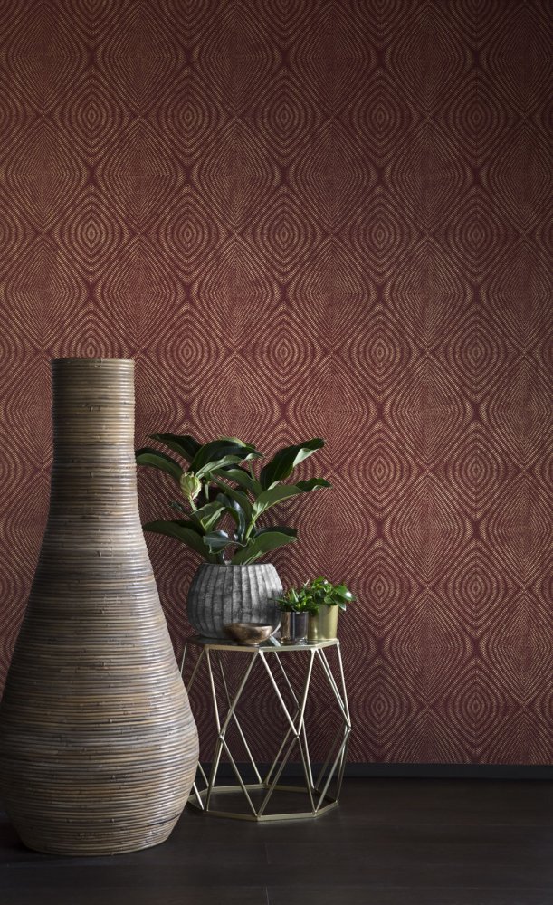 Vliesová tapeta - etnický kosočtvercový vzor. Podklad tmavě cihlový, čárkovaný vzor v barvě metalické zlaté s patinou.