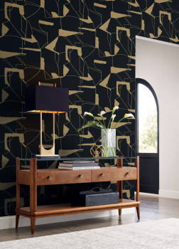 Matná hladká černá vliesová tapeta na zeď, zlatý plastický geometrický vzor.