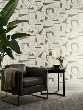 Matná hladká krémová vliesová tapeta na zeď, zlatý plastický geometrický vzor.