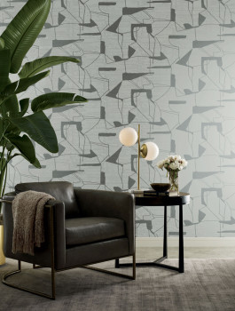 Matná hladká šedá vliesová tapeta na zeď, stříbrný plastický geometrický vzor.