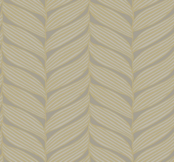 Vliesová tapeta na zeď, šedý podklad, světle šedé listy se zlatými plastickými obrysy.