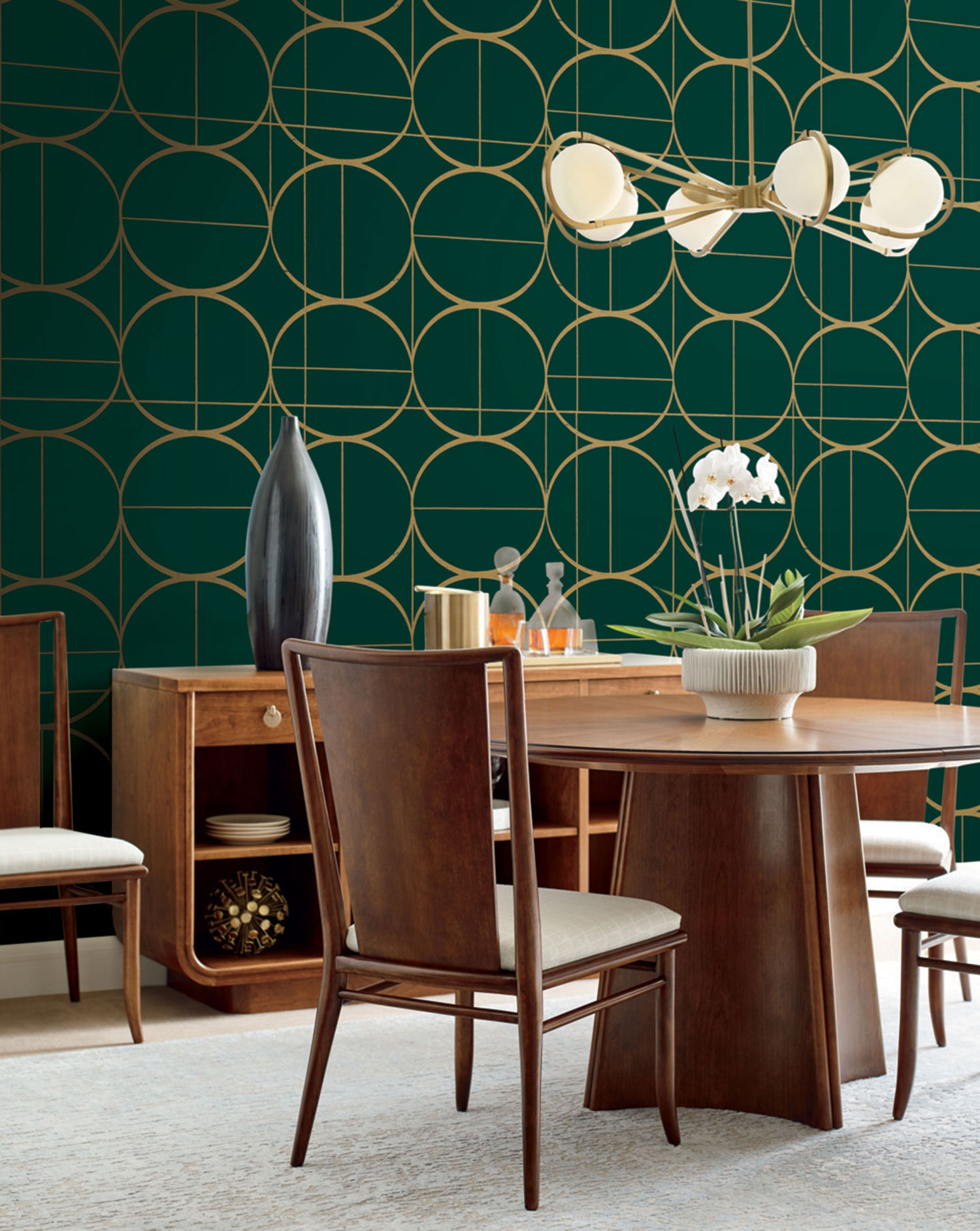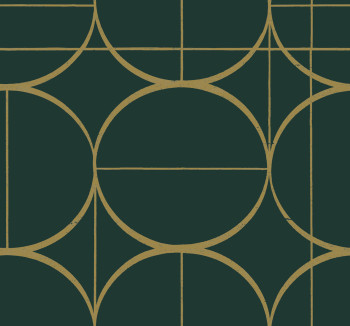 Zelená hladká vliesová tapeta na zeď, plastické zlaté linie a kruhy.