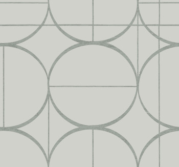 Šedá hladká vliesová tapeta na zeď, plastické stříbrné linie a kruhy.
