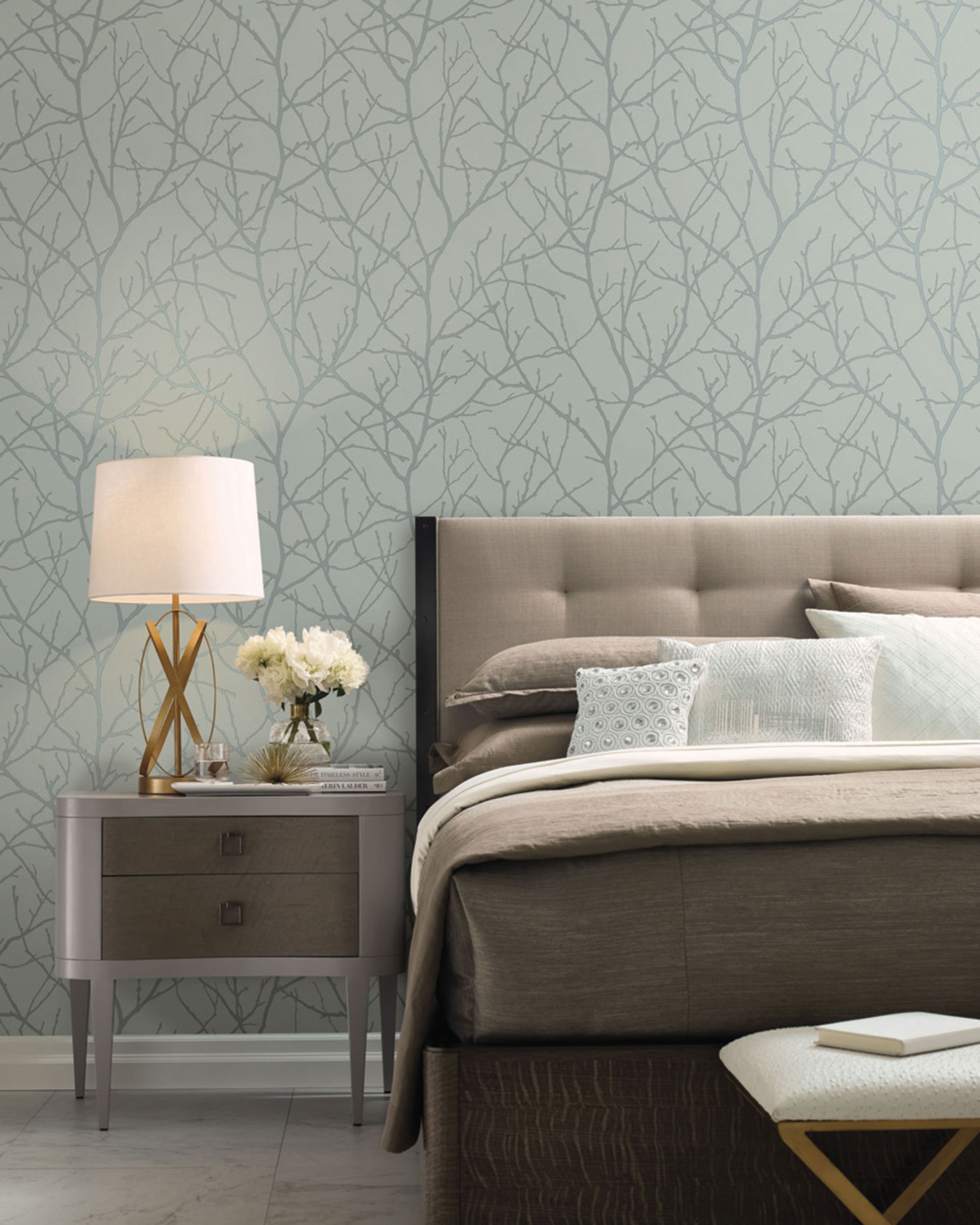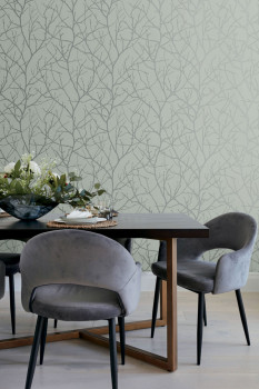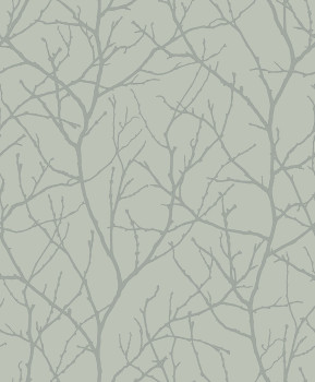 Světle zelená vliesová tapeta na zeď, hladký podklad, plastické stříbrné větvičky stromu.