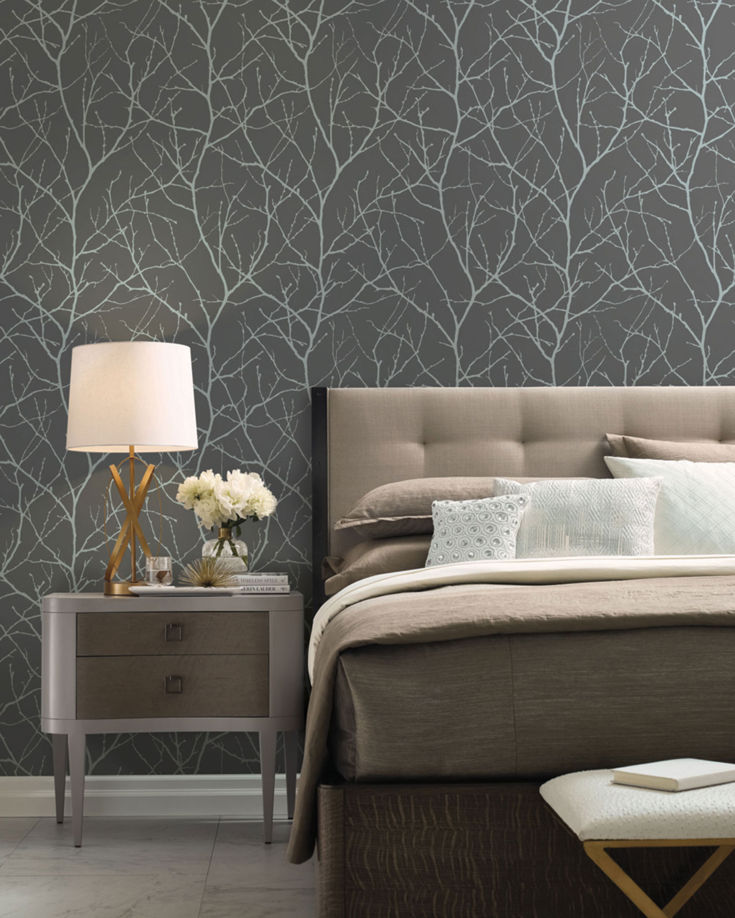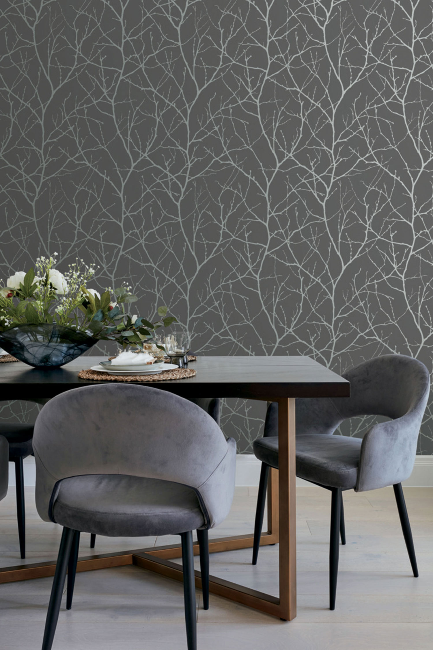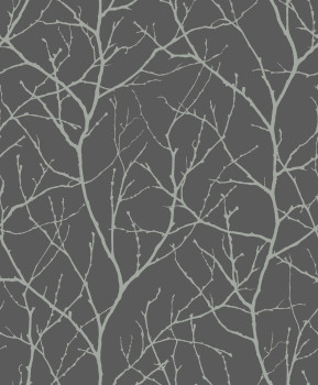 Tmavě šedá vliesová tapeta na zeď, hladký podklad, plastické stříbrné větvičky stromu.
