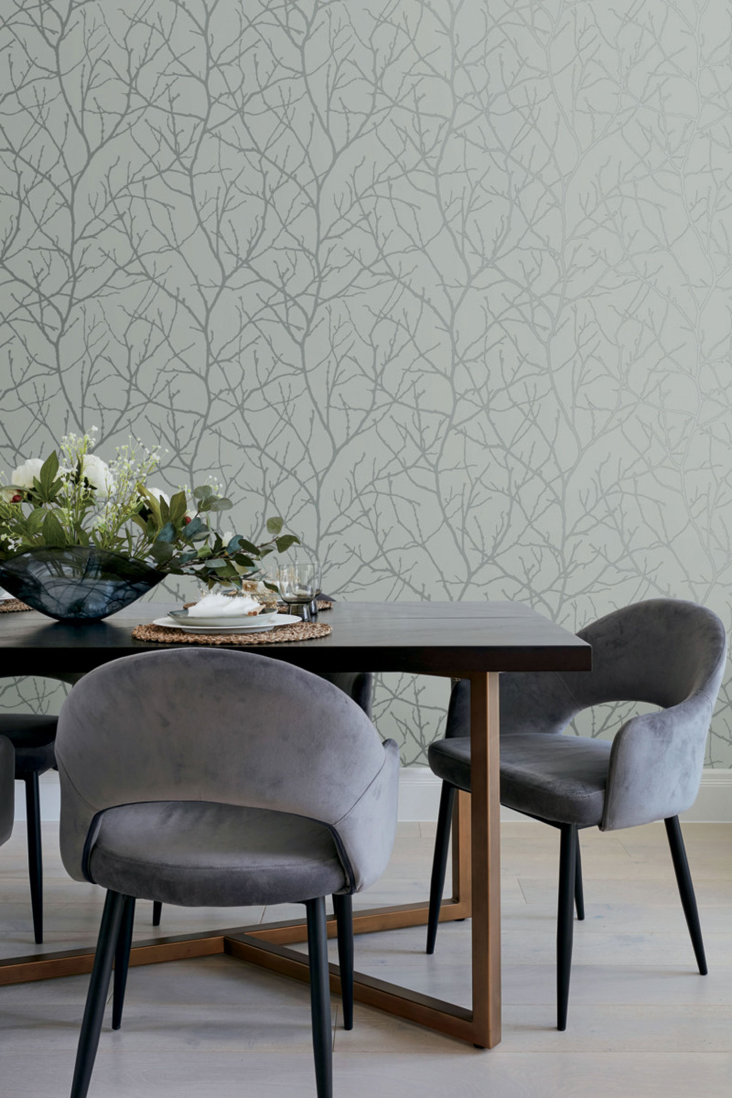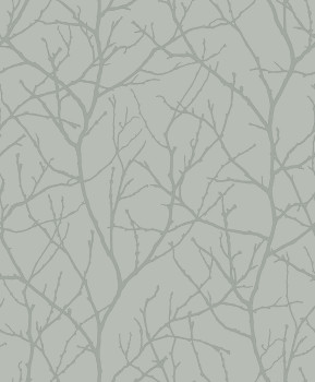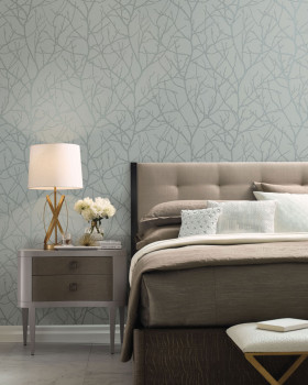 Modro-šedá vliesová tapeta na zeď, hladký podklad, plastické stříbrné větvičky stromu.