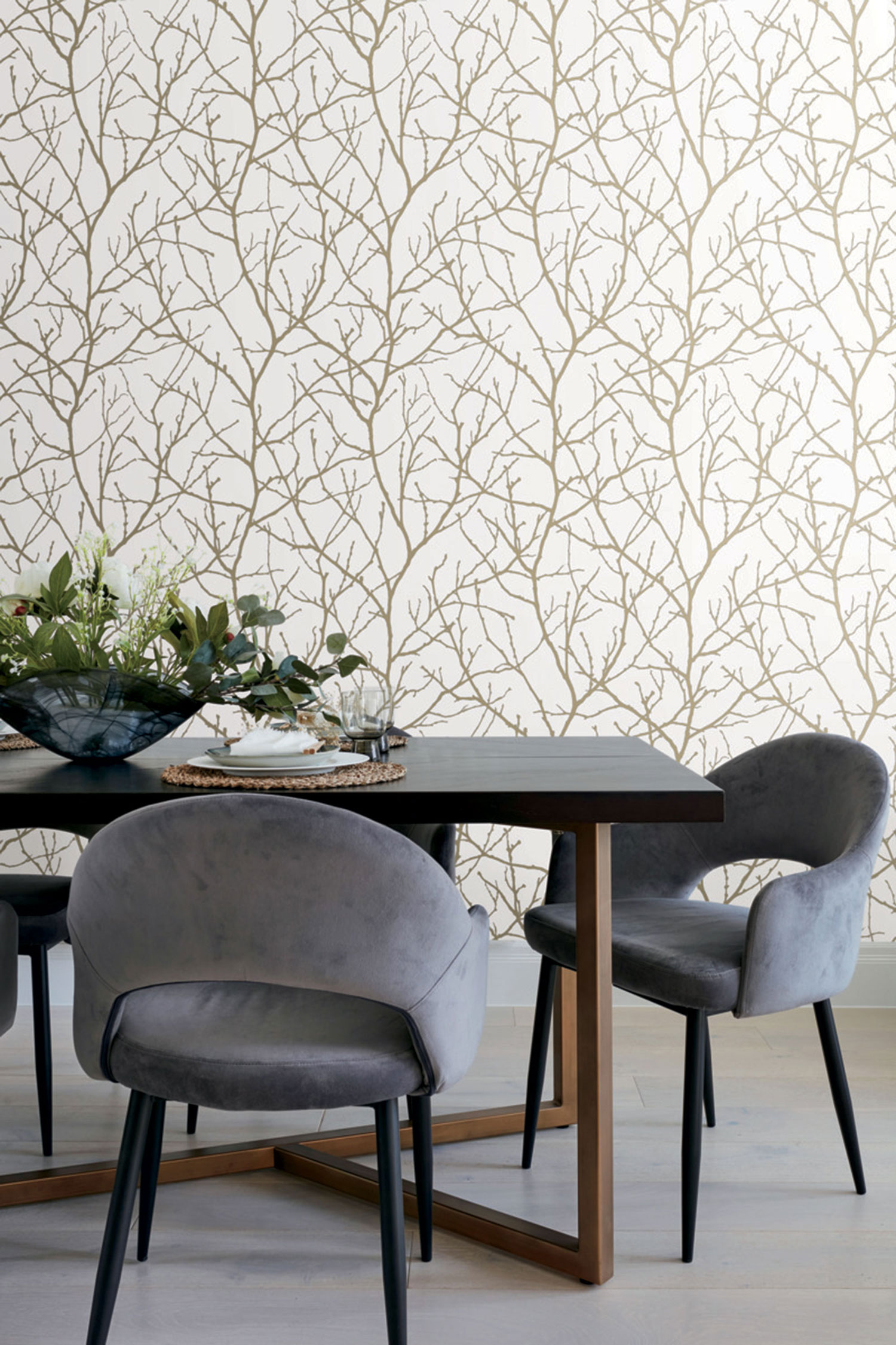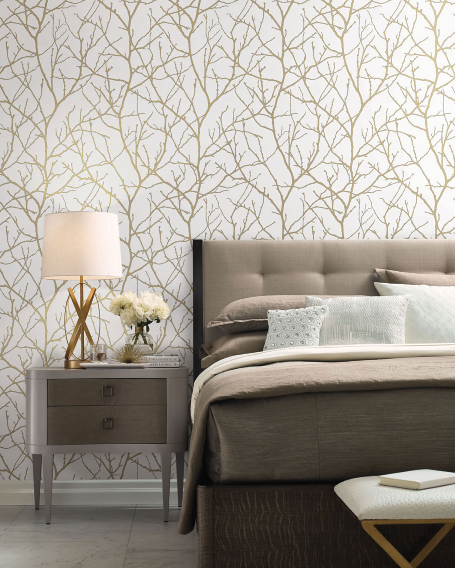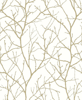 Bílá vliesová tapeta na zeď, hladký podklad, plastické zlaté větvičky stromu.