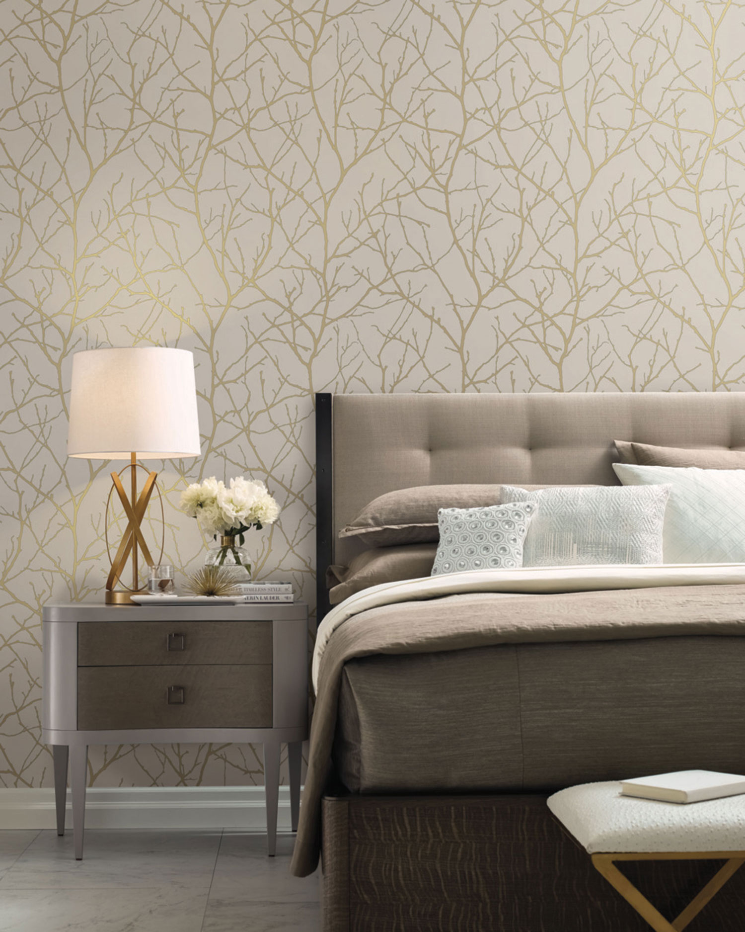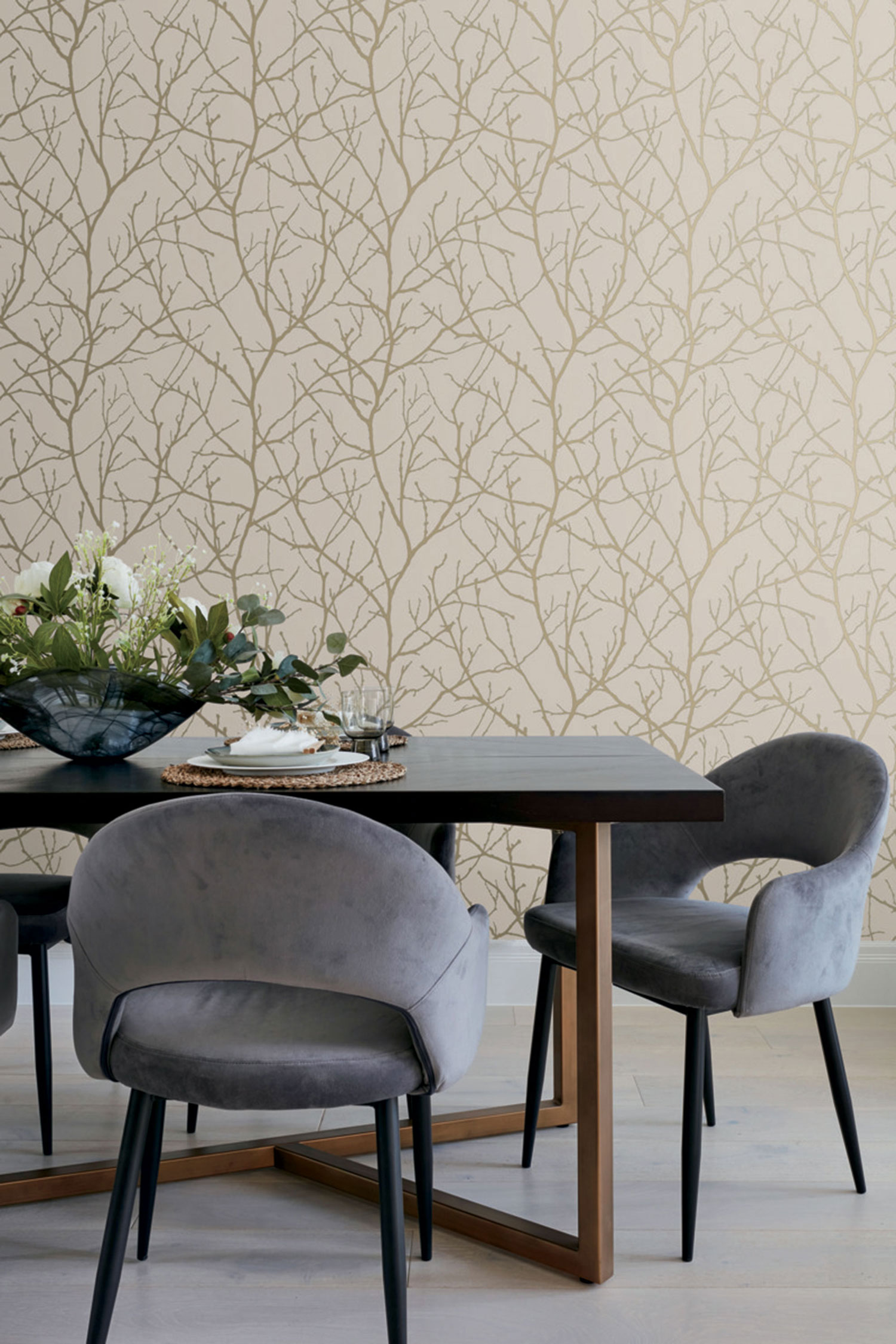 Béžová vliesová tapeta na zeď, hladký podklad, plastické zlaté větvičky stromu.