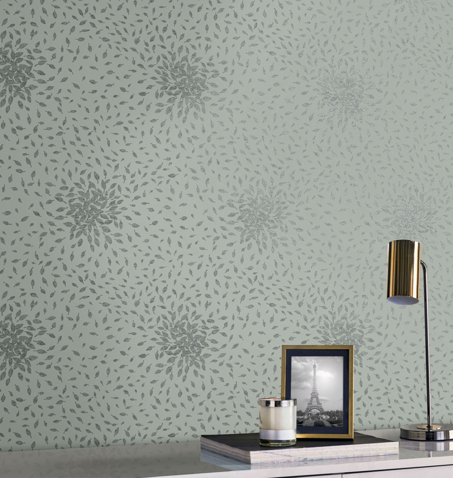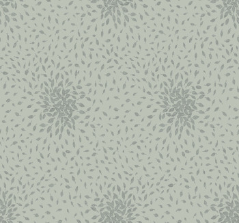 Světle zelená vliesová tapeta na zeď, hladký podklad, plastické stříbrné lístky.