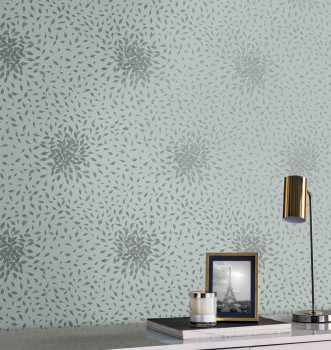 Světle modrá vliesová tapeta na zeď, hladký podklad, plastické stříbrné lístky.