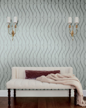 Hladká, matná, světle modrá vliesová tapeta na zeď, plastický stříbrný geometrický vzor.