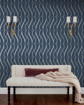 Hladká, matná, tmavě modrá / navy vliesová tapeta na zeď, plastický stříbrný geometrický vzor.