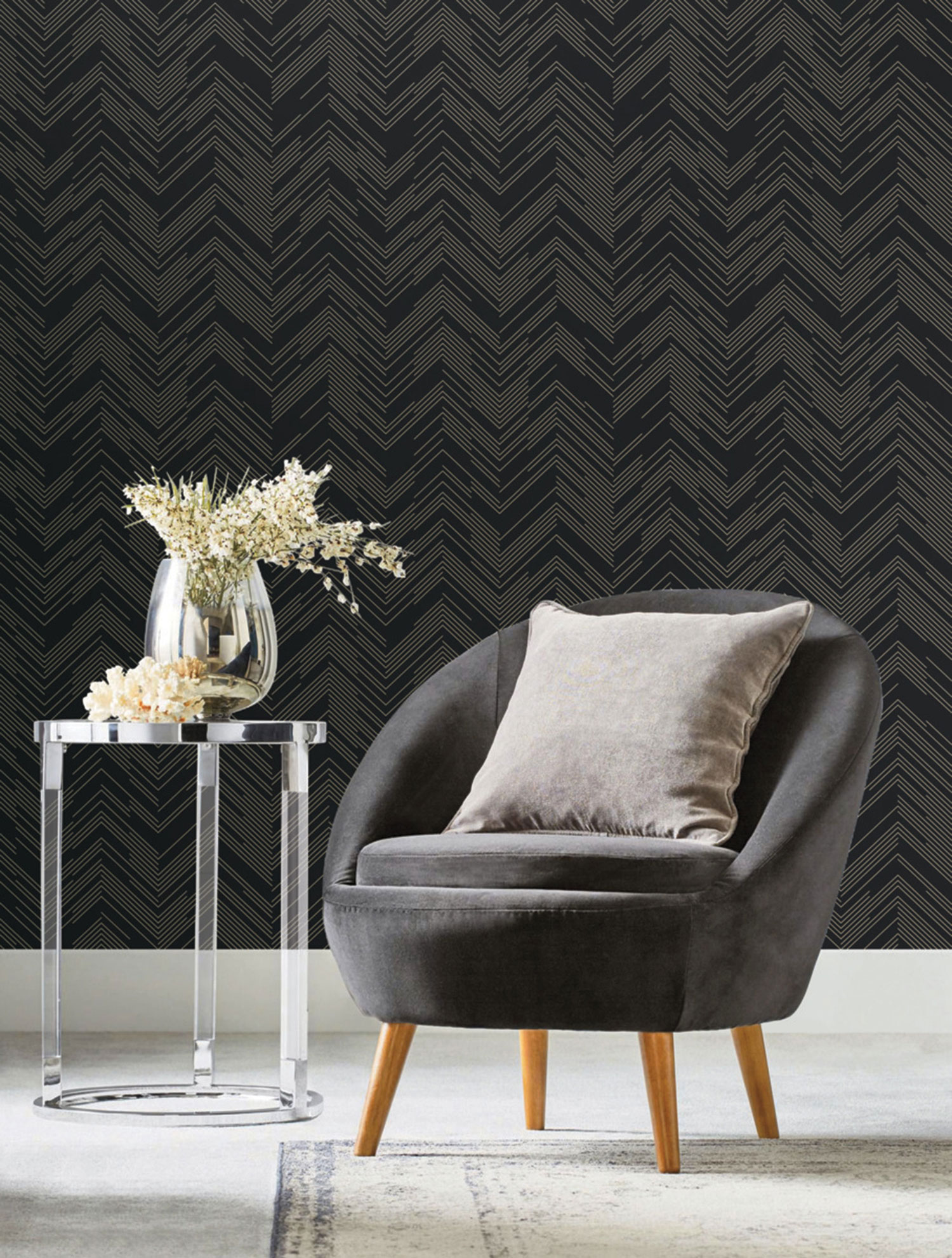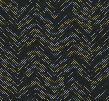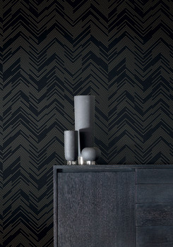 Černá vliesová tapeta na zeď, zlatý plastický cik cak vzor.