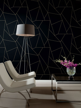 Černá vliesová tapeta na zeď, plastické zlaté linie tvoří geometrické vzory.