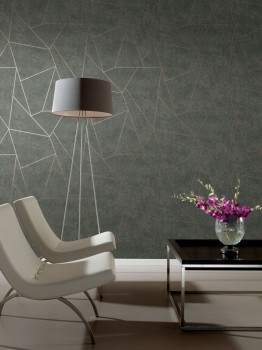 Šedá mramorovaná vliesová tapeta na zeď, plastické zlaté linie tvoří geometrické vzory.