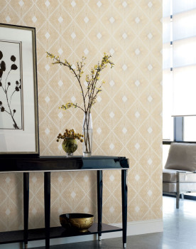 Krémová vliesová tapeta na zeď, plastický geometrický zlatý vzor.