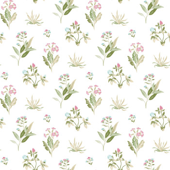 Matná, bílá vliesová tapeta se vzorem růžových, modrých, béžových a zelených květů s listy a větvemi.