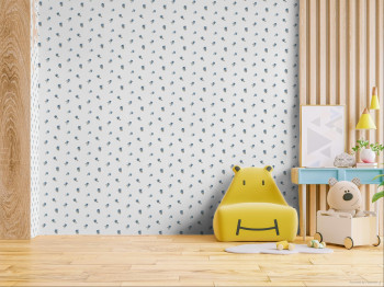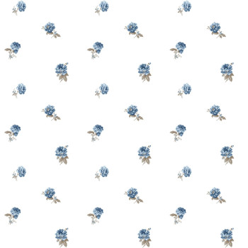 Matná, bílá vliesová tapeta na zeď s květinovým vzorem s listy v modré a béžové barvě.