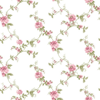 Matná, bílá vliesová tapeta na zeď s květinovým vzorem s listy a plody v růžové a zelené barvě. Foto interiéru je pouze ilustrační - odlišné barvy.