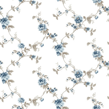 Matná, bílá vliesová tapeta na zeď s květinovým vzorem s listy a plody v modré a béžové barvě. Foto interiéru je pouze ilustrační - odlišné barvy.