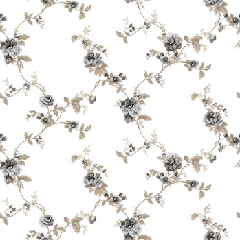 Matná, bílá vliesová tapeta na zeď s květinovým vzorem s listy a plody v šedé a béžové barvě.
