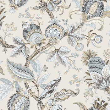 Matná, béžová vliesová tapeta na zeď s květinovým vzorem s listy a plody v bílé, šedé a zlaté barvě. Foto interiéru je pouze ilustrační - odlišné barvy.
