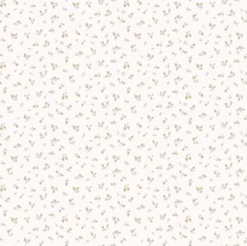 Matná, bílá vliesová tapeta na zeď s drobnými květy s listy v okrové a šedé barvě.