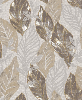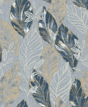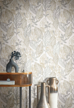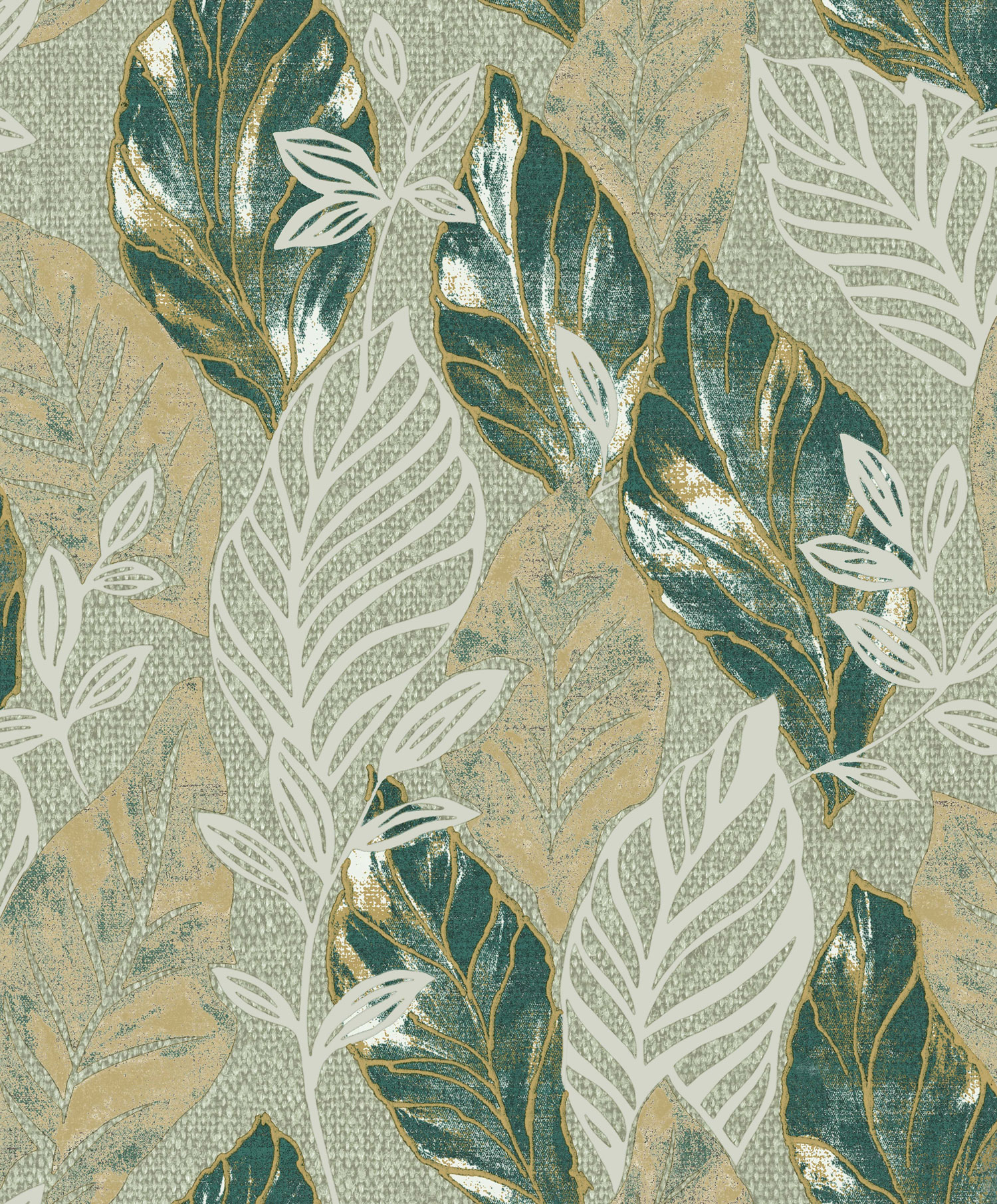 Luxusní zelená vliesová tapeta s vinylovým povrchem, motivy listů, zlaté a stříbrné obrysy a listy. Foto interiéru je pouze ilustrační - odlišné barvy.
