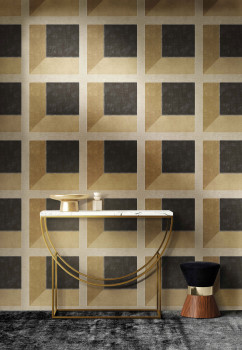 Pololesklá hnědo-zlato-černá vliesová tapeta s vinylovým povrchem, efektní geometrický 3D vzor, látková textura.