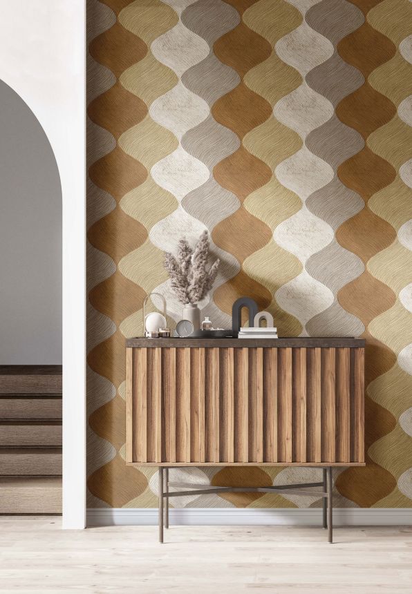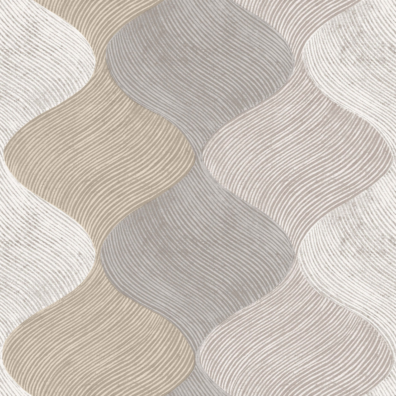 Luxusní vliesová tapeta s vinylovým povrchem, vlnkový vzor v odstínech šedé a béžové. Foto interiéru je pouze ilustrační - odlišné barvy.