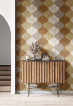 Luxusní vliesová tapeta s vinylovým povrchem, vlnkový vzor v odstínech šedé, hnědo-zlaté a béžové.