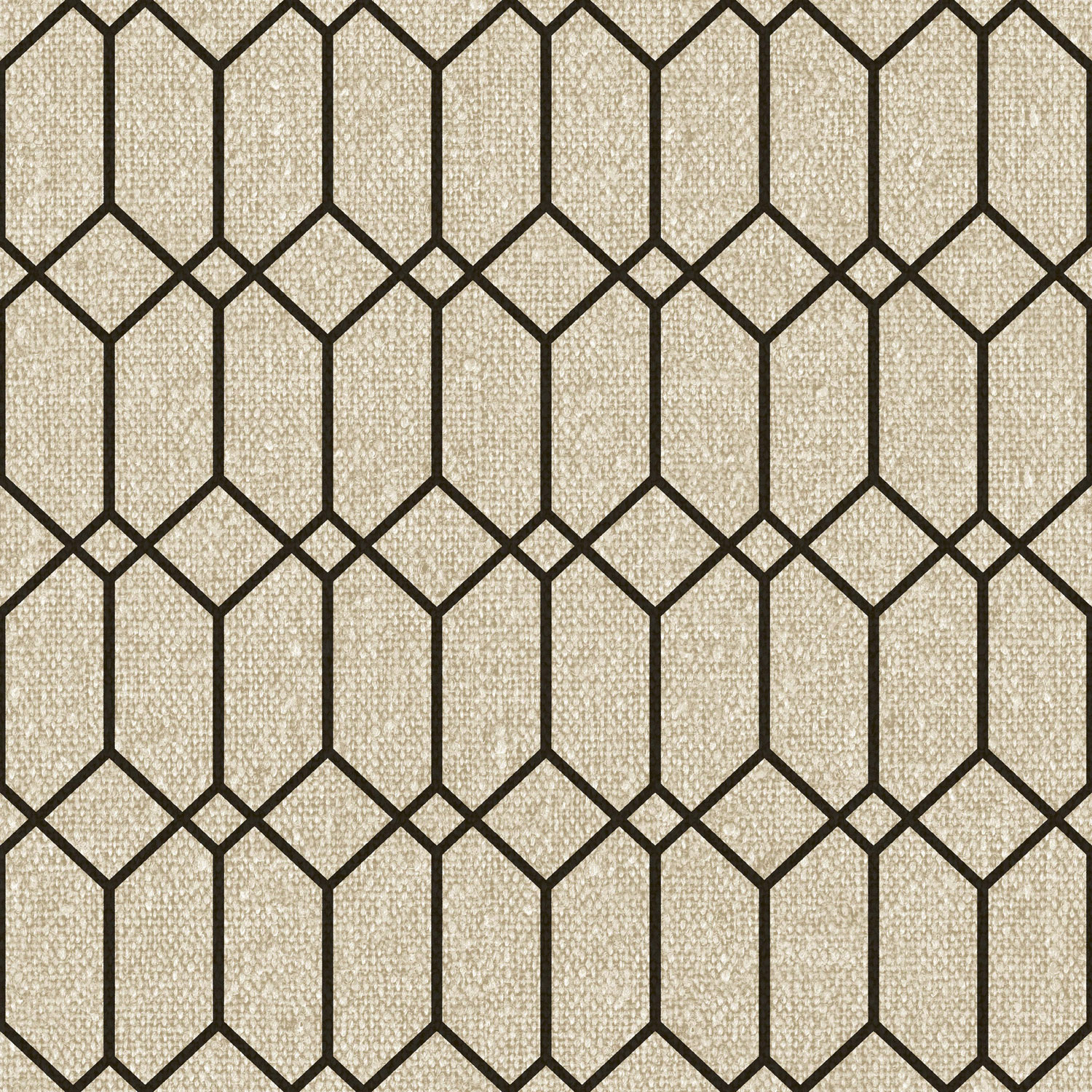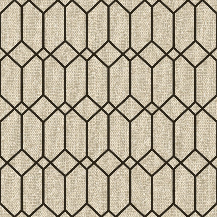 Luxusní béžová vliesová tapeta s vinylovým povrchem, geometrický vzor s černými obrysy, hrubá látková textura.