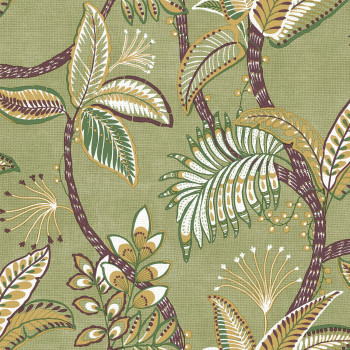 Luxusní zelená vliesová tapeta s vinylovým povrchem, motivy listů, odstíny zelené, vínové a zlaté, látková textura. Foto interiéru je pouze ilustrační - odlišné barvy.