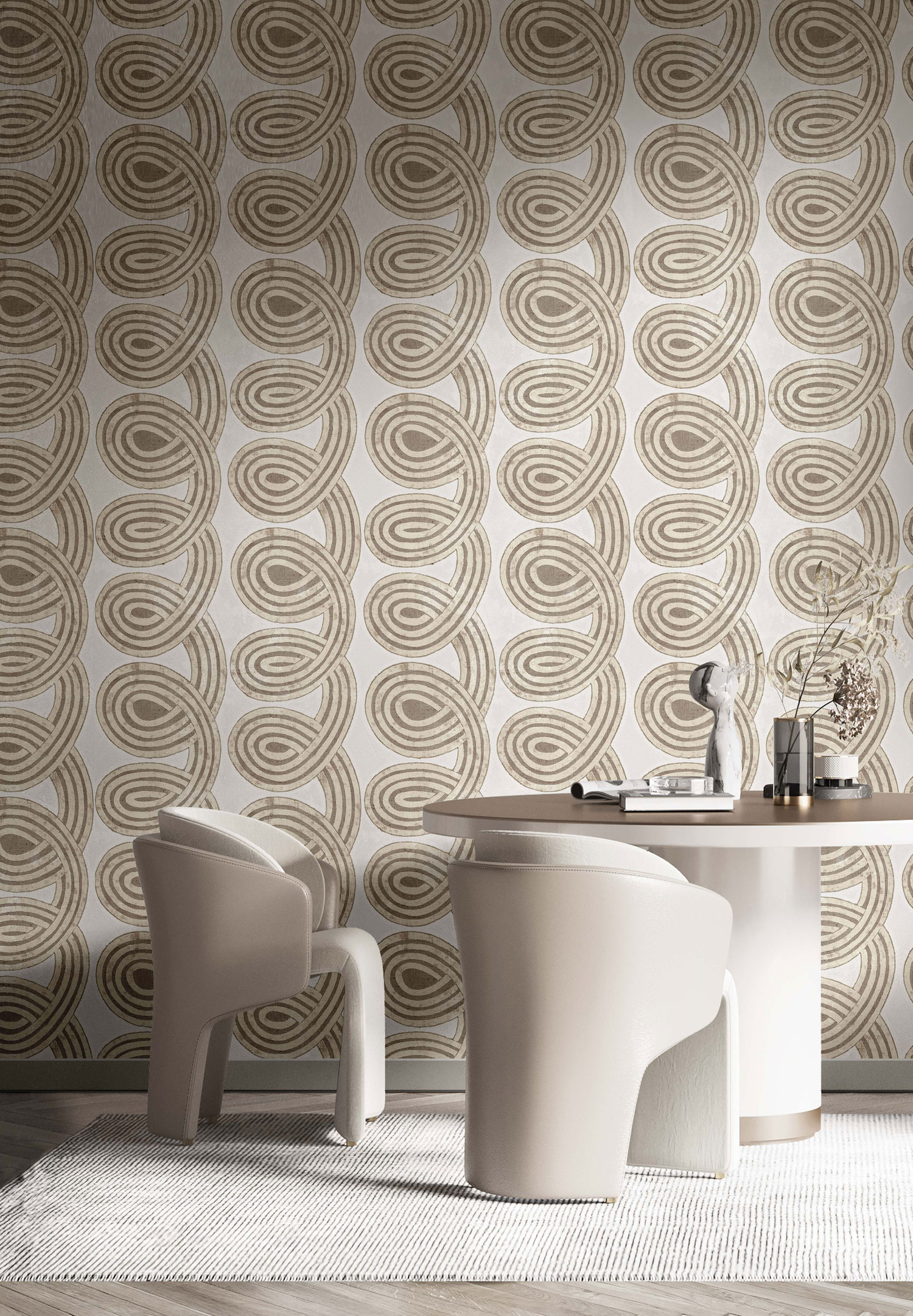 Luxusní béžová vliesová tapeta s vinylovým povrchem, smyčky v ostínech zlaté a hnědo-zlaté, štuková textura.