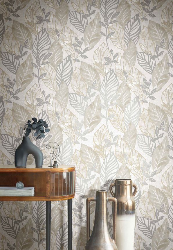 Luxusní šedo-béžová vliesová tapeta s vinylovým povrchem, látková textura. Foto interiéru je pouze ilustrační - odlišné barvy.