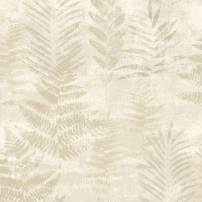 Vliesová tapeta s kapradím a listy v odstínech krémové a béžové, jemný pololesk.