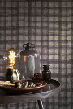 Vliesová, antracitová tapeta. Design drobných kostiček s metalickými zlato-stříbrnými třpytkami.