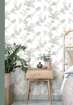 Matná, bílá vliesová tapeta na zeď s motivem barevných květů s listy na bílém podkladě imitující jemnou omítku.