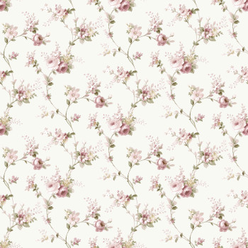Matná, bílá vliesová tapeta se vzorem růžových a vínových květů s listy na podkladě imitující jemnou omítku.
