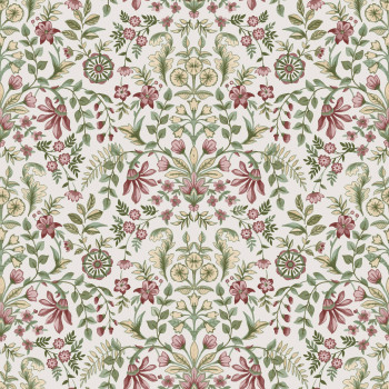 Matná, bílá vliesová tapeta s ornamentálním květinovým vzorem v zelené a vínové barvě na podkladě imitující jemnou omítku.